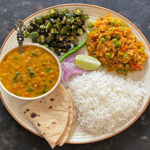 A wholesome North Indian meal with roti, rice, dal, seasonal sabzi, salad, and dessert — simple, nutritious, and full of homely flavours.